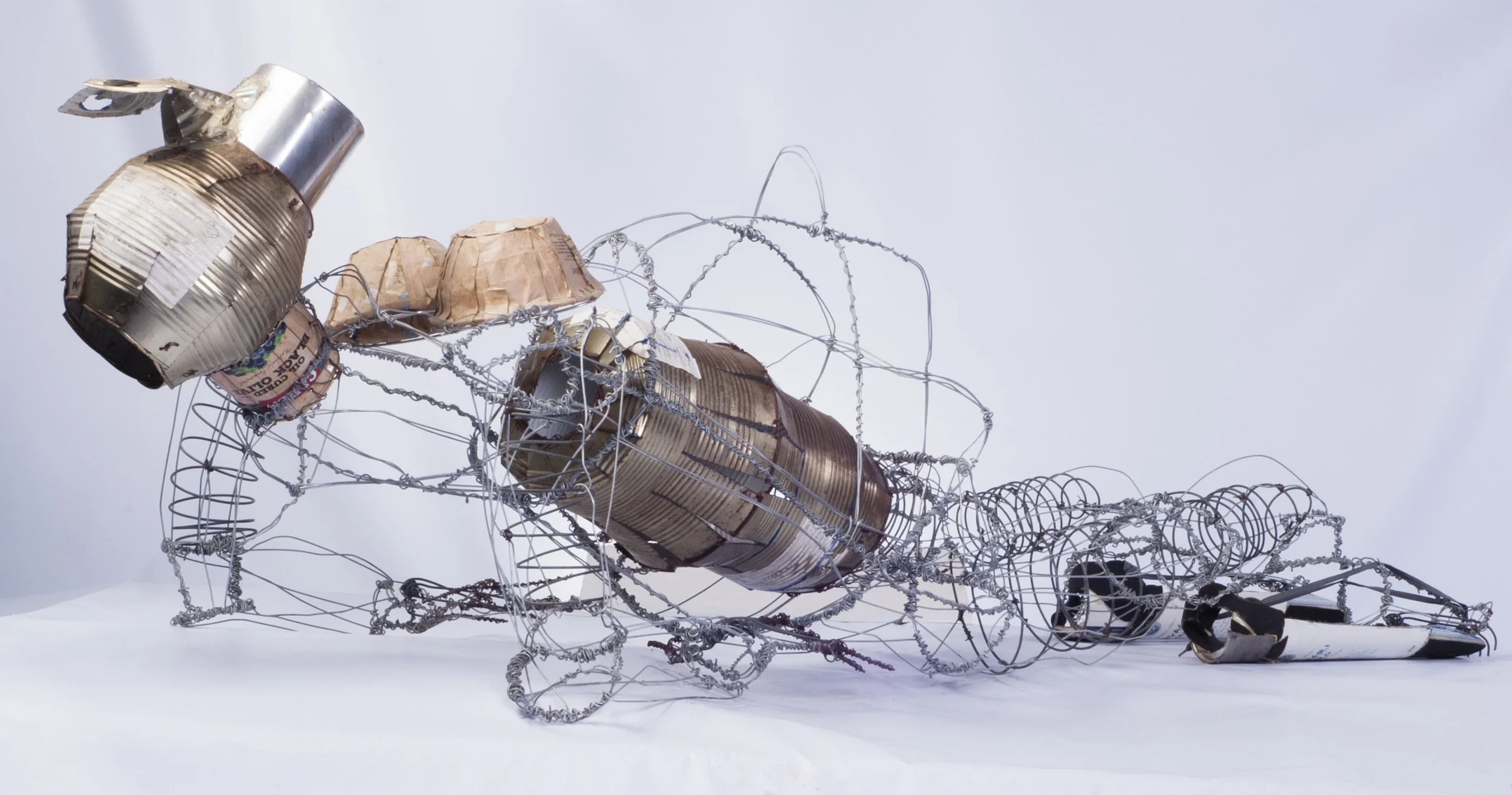 Materials: Iron wires, tin cans, metal from tin can, food packaging, compressed cardboard